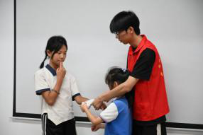 面对一群充满好奇心的“小听众”,实践团成员化繁为简,生动比喻讲解心肺复苏术(CPR),队员们用朗朗上口的顺口溜(如“叫叫CAB”),让孩子们轻松记住关键步骤:“叫”病人、“叫”帮忙、“C”按压、“A”气道、“B”呼吸。看到模拟人“安妮”时,孩子们兴奋不已,在成员手把手指导下,一双双小手认真地按在模拟人胸口,体验了一次“小小急救员”的感觉。现场还巧妙融入“以问促学”“以奖促学”的互动模式,孩子们踊跃抢答,在轻松氛围中掌握了关键理论。