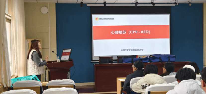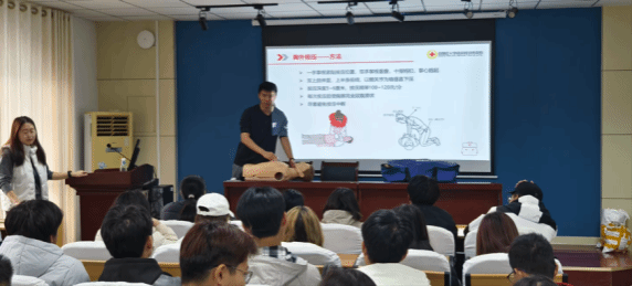 培训中,协会成员基于扎实的应急管理专业基础,将专业救护课程内容与真实场景有机结合,系统讲解了心搏骤停的识别要点与“生存链”运行机制,并重点演示了心肺复苏的标准化操作流程。在讲解自动体外除颤器时,主讲人不仅说明了设备的使用步骤,更从应急管理专业角度分析了在公共场所配置AED的规划逻辑与响应策略,帮助大一同学在掌握技能的同时,理解其背后的应急管理体系设计。