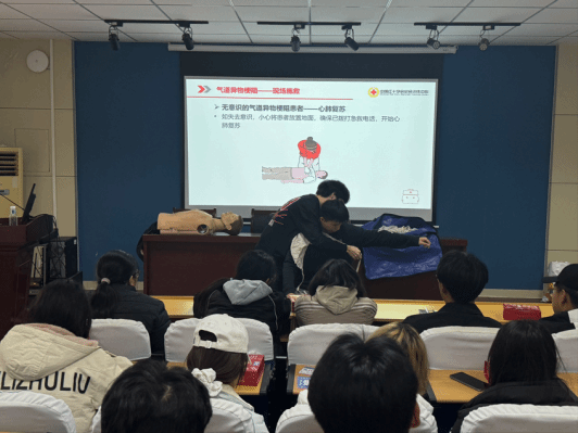 除心肺复苏与AED使用外,培训还延伸至气道异物梗阻处理与三角巾包扎技术等内容,形成了一套完整的初级应急技能教学模块。现场教学不仅注重技术细节,更引导同学们思考如何将应急理论转化为可推广、可复用的校园安全方案,这种“学长带学弟、专业促实践”的模式,正是对“做面向生活的学问”理念的生动诠释。
